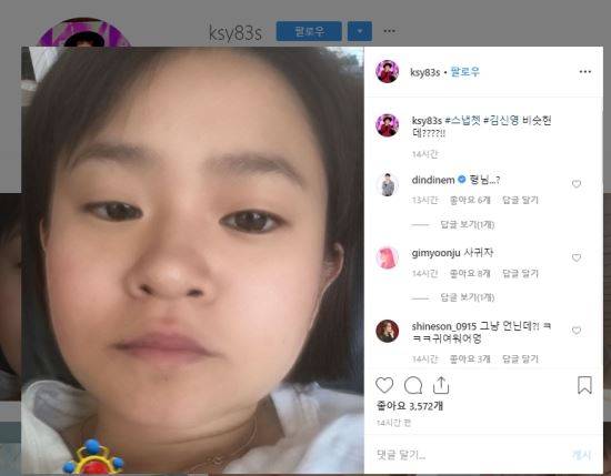 김신영은 23일 인스타그램에 현재의 얼굴을 아기처럼 합성해 주는 스마트폰 애플리케이션(앱)으로 촬영한 사진 한 장을 공개했다. 이 앱을 이용하면 코와 입 부위 등 하관을 짧고 통통하게 만들어줘 ‘동안’으로 변신할 수 있지만, 김신영의 얼굴은 평소와 다를 바 없어 보였다. 김신영도 “(지금과)비슷하다”고 적었다.