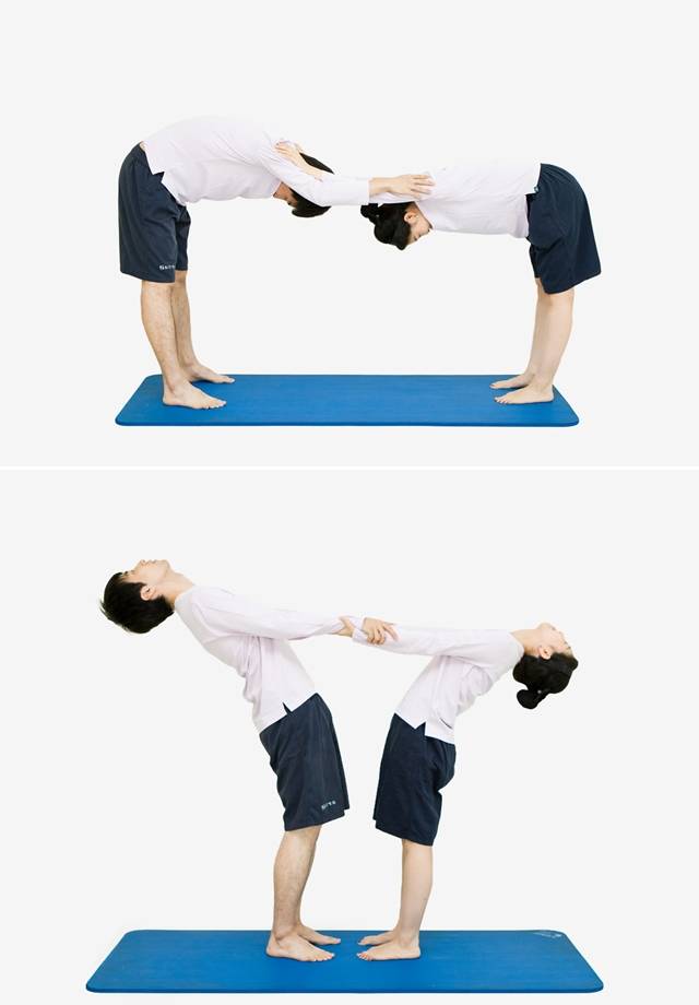 마주보고 서서 상대방의 어깨에 손을 얹는다. 뒤로 서서히 물러나면서 상체와 머리를 숙이고 양손으로 어깨를 지긋이 누르며 허리를 쭉 핀다. 마주보고 서서 발이 가까워진 상태에서 서로 손목을 잡고 호흡을 맞추면서 서서히 상체를 뒤로 젖힌다. 15초~20초 정도 유지한 후 가볍게 당기는 느낌이 날 정도의 강도로 반복한다.