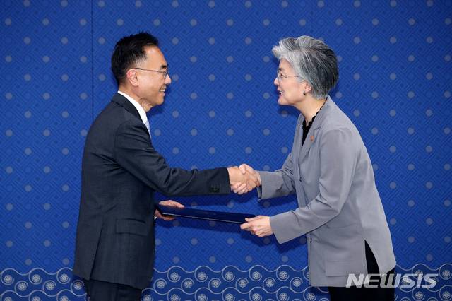 【서울=뉴시스】김병문 기자 = 강경화(오른쪽) 외교부 장관이 3일 오후 서울 종로구 외교부 청사에서 열린 총영사 임명장 전수식에 참석해 김준구 주호놀룰루 총영사에게 임명장을 전달하고 있다. 2019.05.03.