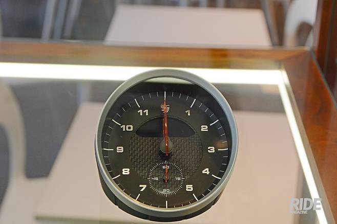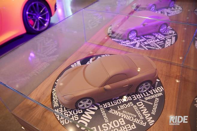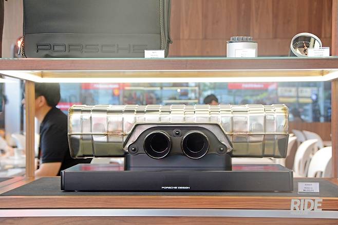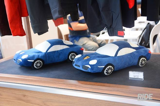 1층은 포르쉐 브랜드 액세서리와 1/43크기의 다양한 스케일 프라모델들이 전시되어있다. 포르쉐 브랜드의 가방, 쿠션, 셔츠, 시계 뿐만 아니라 실제 911 GT3의 배기팁으로 만든 사운드바도 전시되어 눈길을 끌었다.
