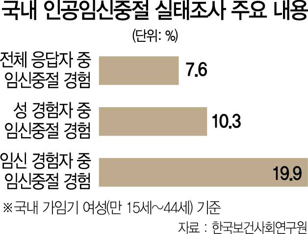 연구원은 또 설문에 참여한 1만명을 국내 가임기 여성 전체 규모로 환산했을 때 연간 인공임신중절 수술 규모를 연간 4만9,764건으로 추정했다. 처음 설문조사를 실시한 2005년에는 34만2,433건이었고 가장 최근 조사인 2010년에는 16만8,738건이었다. 여성의 피임률과 사후피임약 처방이 늘고 가임기 인구가 감소세를 이어가고 있다는 점을 인공임신중절 수술이 줄어든 원인으로 분석했다.