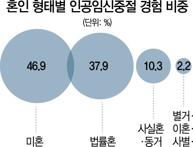 인공임신중절을 경험한 여성의 19.9%는 수술을 결심할 당시 임신 경험이 있었다고 응답했다. 성 경험이 있는 여성 중에서는 10.3%가 인공임신중절 경험이 있는 것으로 조사됐다. 인공임신중절을 받은 여성의 평균 연령은 28.4였고 최저 17세, 최대 43세로 집계됐다. 혼인 형태별로는 미혼이 46.9%로 가장 많았고 법률혼(37.9%), 사실혼·동거(13.0%), 별거·이혼·사별(2.2%)가 뒤를 이었다. 수술 시기는 임신 12주 이하가 95.3%로 대다수를 차지했다.