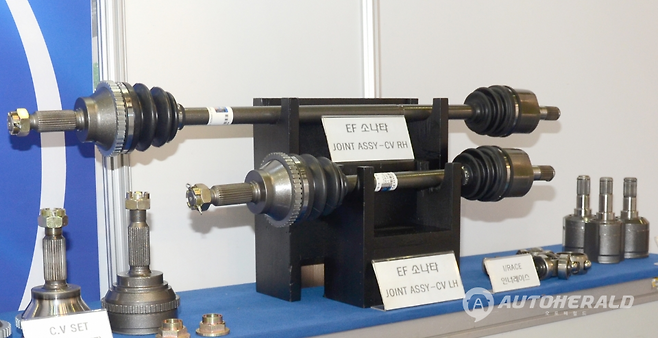 일명 CV 조인트로 불리는 이것은 볼베어링 타입을 비롯해 종류만 해도 수 십여 종에 이를 뿐 아니라 차량 설계에 따라 꺾임 각도나 회전특성 또한 다양한 것이 특징입니다. 일반적으로 조인트의 꺽임각도는 아웃보드 조인트의 경우 40~46도 이내, 이너보드 조인트의 경우 23~25도 이내로 설계되고 있으며, 변속기와 연결되는 이너보드 조인트의 경우 차체의 움직임에 따라 약간의 길이변화가 가능하도록 슬라이딩이 가능한 스플리트 기어가 적용되고 있습니다.