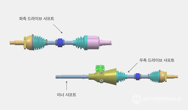 한편 전륜구동 차량의 경우 엔진과 변속기가 차량 주행방향과 90도를 이루는 가로배치타입이 주를 이루면서 드라이브샤프트를 연결할 때 드라이브샤프트의 장착위치가 차량중심에 있지않아 좌우 샤프트의 길이가 달라질 수밖에 없습니다. 변속기가 엔진의 오른쪽이나 왼쪽 옆에 위치하기 때문입니다. 국산차의 경우 대부분 왼쪽 드라이브샤프트보다 오른쪽 샤프트의 길이가 긴 편입니다.