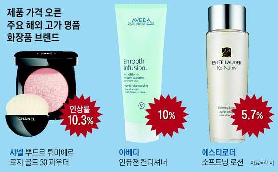 루이비통 브랜드를 갖고 있는 프랑스 LVMH의 화장품 브랜드 메이크업포에버는 상품 가격을 최대 200% 파격 인상했다. 찍어 바르는 화장품을 담는 용도인 팔레트(케이스) 가격이 3000원에서 9000원으로 치솟았다. 쿠션 제품 가격은 최대 17.9% 뛰었다. 이 밖에도 에스티로더의 소프트닝 로션(250mL)이 8만7000원에서 9만2000원으로, 아베다 인퓨젼 컨디셔너(200mL)는 3만원에서 3만3000원으로 5~10% 올랐다.