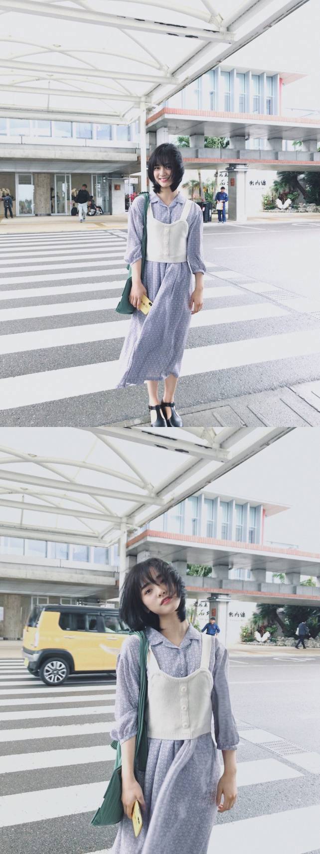 사진 속 심월은 원피스를 입고 환히 웃으며 횡단보도에 서있다.