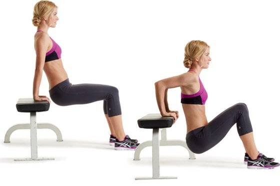 의자를 뒤에 놓고 양손으로 짚은 뒤 엉덩이를 내렸다 올리는 운동입니다. 이때 팔을 ㄱ자로 구부리면서 삼두근 쪽에 체중을 실어주는 게 핵심입니다. 한 번에 15번씩 3세트를 해주면 충분합니다.
