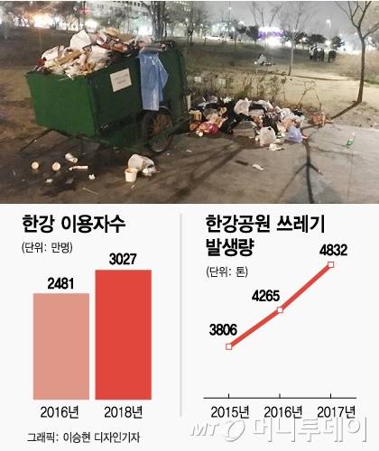 하지만 방문자수와 맞물려 최근 3년간 한강공원의 쓰레기 발생량 역시 2015년 3806톤, 2016년 4265톤, 2017년 4832톤 등 해마다 12% 이상 증가하고 있다.