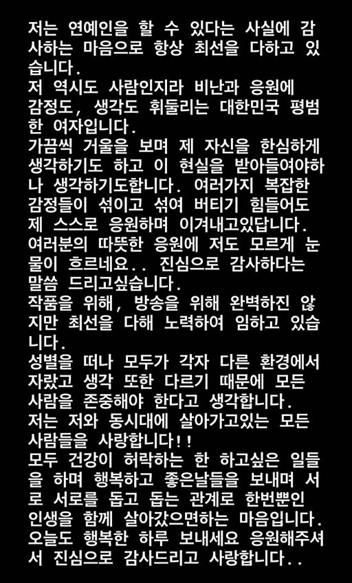 그러면서 “여러분의 따뜻한 응원에 저도 모르게 눈물이 흐른다”며 메시지를 보낸 팬에게 간접적으로 감사 인사를 전했다.