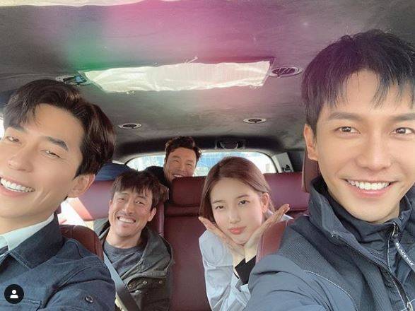 공개된 사진은 배우 신성록, 장혁진, 신승환, 수지, 이승기가 마지막 촬영을 마친 후 차 안에서 '배가본드' 기념샷을 남긴 모습.