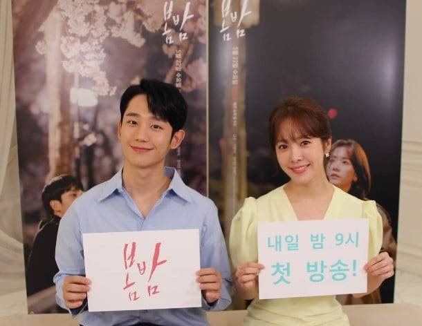 22일 첫 방송을 앞두고 공개된 사진 속에는 정해인(유지호 역)과 한지민(이정인 역)이 '봄밤, 내일 밤 9시 첫 방송!'이라는 본방사수 독려 메시지를 들고 완벽 비주얼을 뽐내고 있어 시선을 강탈하고 있다.