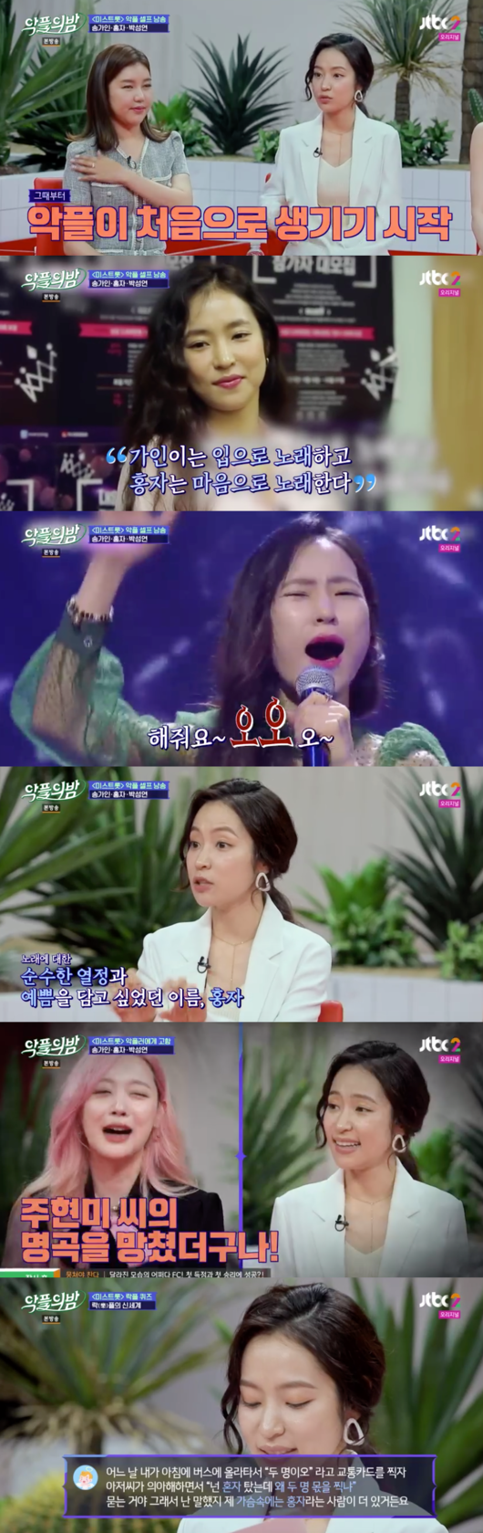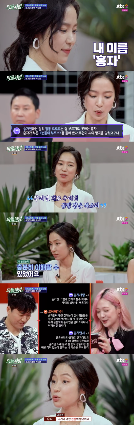 28일 방송된 JTBC2 '악플의 밤' 2회에 TV조선 '미스트롯' 출신 송가인, 홍자, 박성연이 첫 번째 게스트로 나왔다.