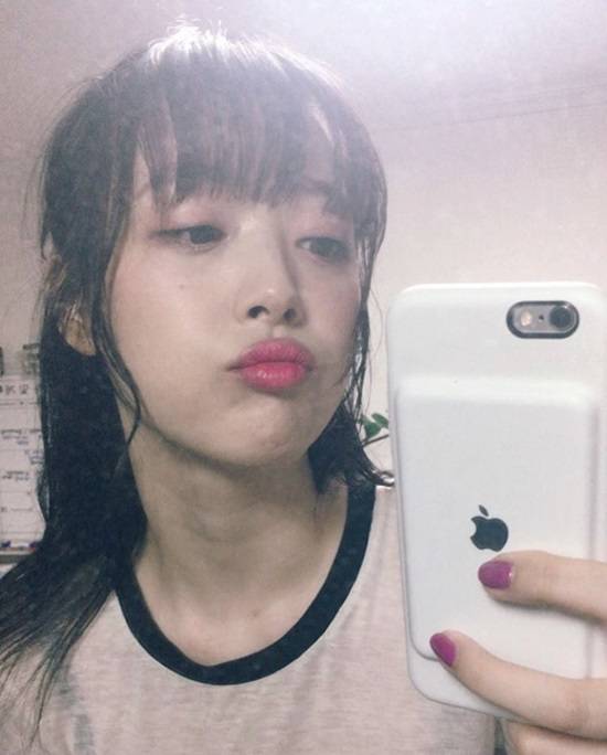 공개된 사진 속 설리는 뾰루퉁한 표정을 지으며 셀카를 찍고 있다. 특히나 앞머리를 내린 모습이 귀여운 매력을 더 돋보이게 한다.
