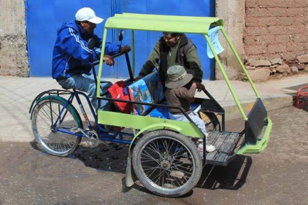 사람의 힘으로 달리는 자전거에 바퀴를 하나 더 달아 2∼3명의 손님을 뒤에나 앞에 태우고 가는 자전거 택시이다. 엔진이 없어 100% 환경 친화적이며 돈 들데가 없어 가난한 나라 페루에 안성맞춤인 세 발 자전거택시는 태양을 섬기는 잉카 도시의 발 역할을 톡톡히 하는 명물이다. 그런데 하늘 도시인 마추픽추에 가는 것은 너무 멀고 높아 노 땡큐 란다.