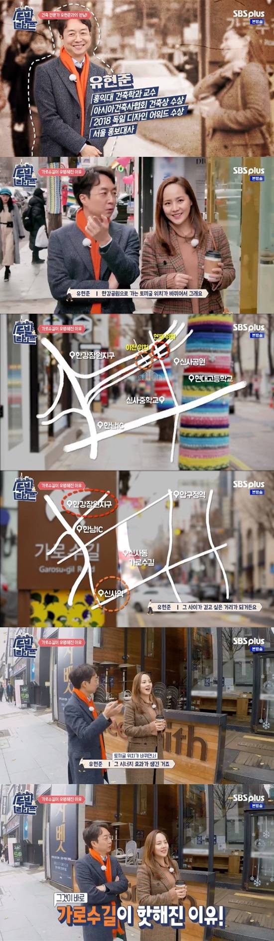 유진은 함께 걷게 된 유현준에 대해 “중후한 멋이 있다. 같이 걸으면 재미있고 뭔가 색다른 경험이 될 것 같은 그런 분이다”며 “사실 저도 처음 만나는 분이다” 소개했다. 이어 유진과 유현준이 함께 가로수길을 걸으며 대화를 나눴다.