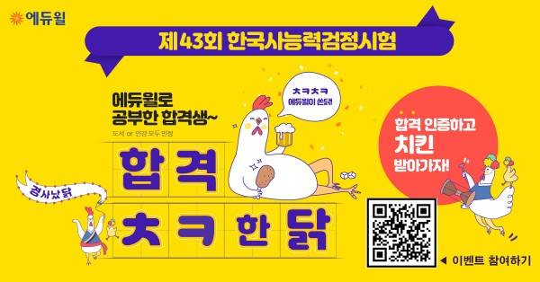 종합교육기업 ㈜에듀윌이 제43회 한국사능력검정시험 합격생을 위한 '합격ㅊㅋ한닭'이벤트를 진행한다고 밝혔다.