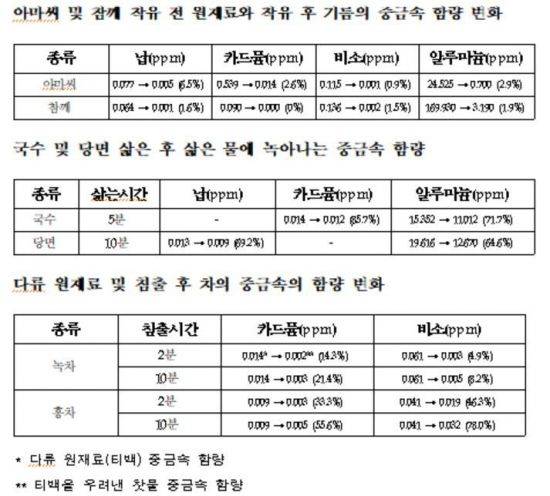 식약처는 식용유지 원재료, 다류, 면류를 대상으로 착유, 추출, 삶기 등의 방법에 따라 가공·조리 전 후 중금속 함량이 어떻게 달라지는지 조사했다. 그 결과 중금속은 물에 잘 용해되는 반면 기름에는 잘 섞이지 않았다.