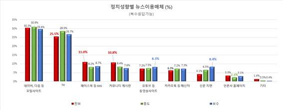 진보성향의 응답자들(SNS 11.0%, 커뮤니티 10.8%)은 중도(SNS 8.2%, 커뮤니티 8.4%) 및 보수성향의 응답자들(SNS 8.7%, 커뮤니티 7.6%)보다 상대적으로페이스북 등의 SNS와 인터넷 커뮤니티를 통해 뉴스를 더 많이 이용했다.