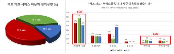 팩트체크 서비스 이용경험자들의 정치성향은 진보성향이 45%로 가장 많고, 다음으로 중도성향 36% 그리고 보수성향은 19%로 가장 적은 비중을 차지했다.