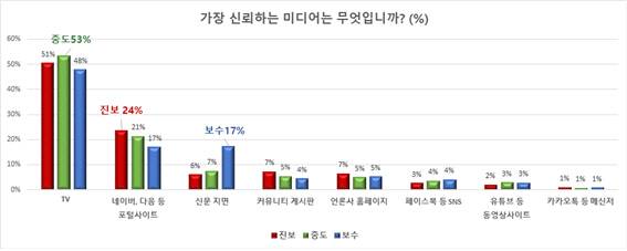 연세대 바른ICT연구소(소장 김범수)가 전국의 성인 1312명을 대상으로(남성 655명, 여성 657명, 평균 40.98세) 정치성향에 따른 뉴스매체 이용현황 및 미디어 인식을 조사해 보니, 가장 신뢰하는 뉴스매체로 전체 응답자의 51%가 TV를 선택해 가장 높은 신뢰를 보였다.