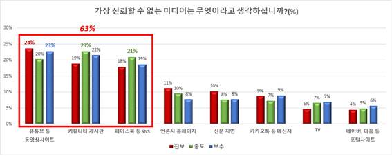 가장 많이 선택한 ‘신뢰할 수 없는’ 미디어는 동영상사이트(진보성향 24%, 보수성향 23%), 커뮤니티(진보성향 19%, 보수성향 22%), SNS(진보성향 18%, 보수성향 19%) 순이었다.