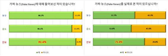 가짜뉴스에 대해 들어본 응답자 비중은 중도성향(86.1%)이나 보수성향(88.2%)보다 진보성향(91.6%)에서 더 높고, 가짜뉴스를 실제 본 적 있다는 응답 역시 중도성향(53.0%)이나 보수성향(57.7%)보다 진보성향(71.0%)에서 더 높았다.