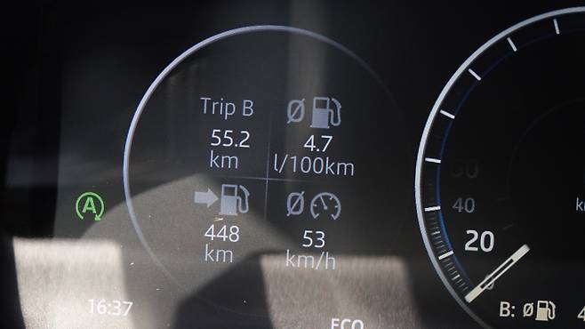 파주에서 서울까지 55km를 에코 모드로 달리며 측정해본 연비는 21.1km/L를 기록했다. 메이커가 밝힌 이 차의 공인 복합 연비는 12.4km/L. 계기판에서는 가속페달, 브레이크 페달, rpm 사용 등의 효율을 보여준다. 이를 참고하면서 운전하면 공인복합연비 이상의 연비를 만날 수 있다.
