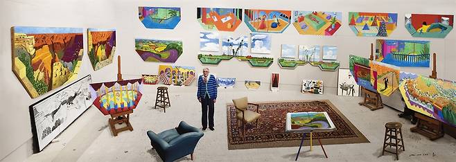 | ▲ <2017년 12월, 자신의 스튜디오에서>(2017) 호크니의 작품들과 형형색색의 옷차림을 한 호크니의 모습이 담겨 있다. 불과 2년도 채 되지 않은 작품으로 작가의 최근 관심사인 시공간의 확장이 고스란히 담겨있다. 3000장의 사진을 붙인 파노라마형 사진 드로잉으로, 공간보다는 표면을 강조하는 사진의 한계를 기술 활용으로 풀어내려는 호크니의 시도가 돋보인다. 호크니가 테이트 브리튼에 기증해 보관 중이던 작품이다. 이걸 전세계 최초로 볼 수 있는 곳이 바로 서울이다. |