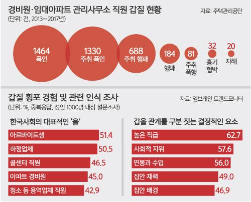 경비원에 대한 입주민의 갑질 횡포는 어제오늘 일이 아니다. 주택관리공단에 따르면 2013년부터 2017년까지 경비원과 임대아파트 관리사무소 직원이 입주민으로부터 폭행이나 폭언을 당한 사례는 3702건에 달한다. 지난해 11월에는 층간소음 민원을 해결해주지 않는다는 이유로 입주민에게 폭행을 당해 뇌사에 빠진 70대 경비원이 끝내 사망하는 사건이 발생하기도 했다.