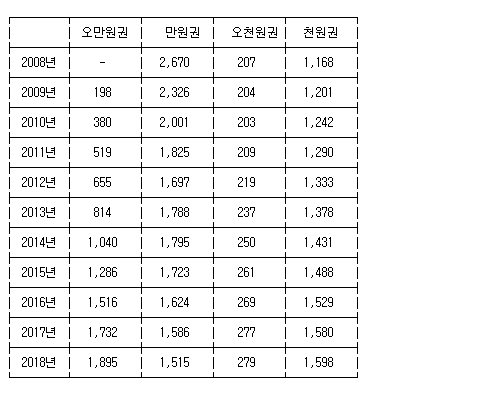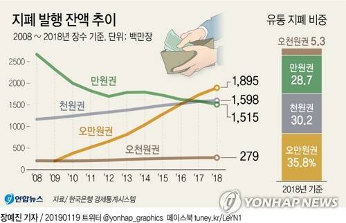 앞서 2017년 말엔 장수로도 오만원권에 역전을 허용했다. 오만원권 비중은 작년 말 기준으로 35.8%까지 높아졌다.