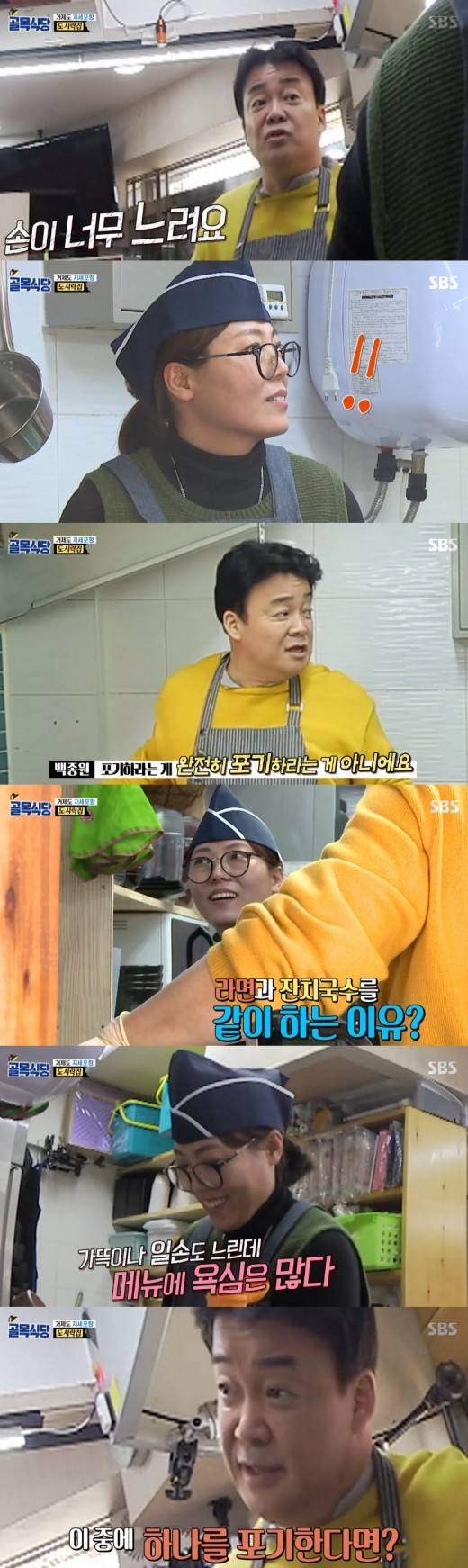 백종원은 “왜 둘 중 하나를 포기하라고 했느냐면 사장님 손이 너무 느려서 그렇다. 걱정이 되는 거다. 그렇다고 메뉴를 완전히 포기하라는 게 아니다”라고 말했다.