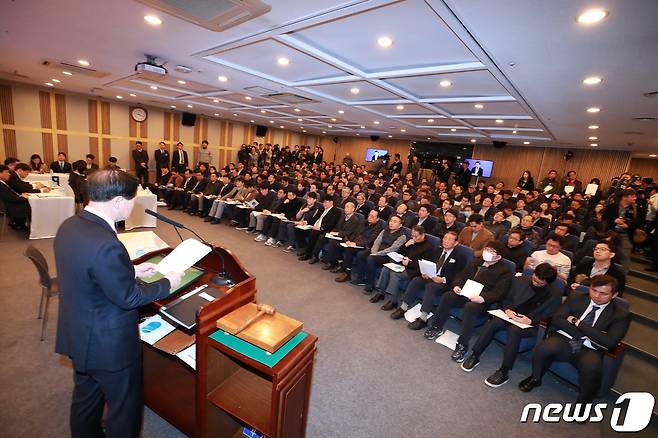 (서울=뉴스1) 이광호 기자 = 27일 오전 서울 강서구 대한항공 본사에서 열린 정기 주주총회에서 의장을 맡은 우기홍 대표이사가 인사말을 하고 있다. 2019.3.27/뉴스1