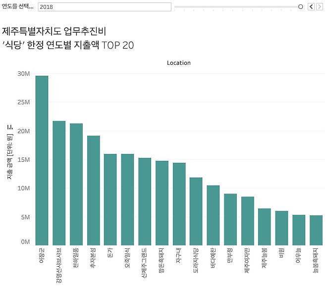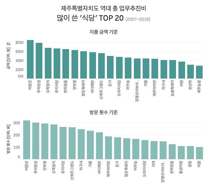 제주도가 지출 장소를 명시한 곳 중 음식점만 추렸다. 해당 음식점에 쓰인 업무추진비 전액이라고 보긴 어렵다. 아예 장소가 써있지 않거나, '음식점' 등으로 뭉뚱그려 표기한 내역이 많기 때문. 다만 파악 가능한 집행 횟수나 액수는 분명한 '맛집의 증표'인 만큼 가능한 범위 내에서 다각도로 분석했다.