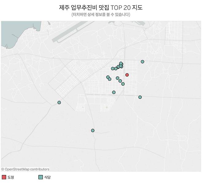 제주는 '관광도시'입니다. 특산물을 재료로 한 맛집이 넘치죠. 하지만 제주도청 공무원들은 멀리 나가지 않는다는 걸 지도를 보시면 알 수 있습니다. 제주도에 거주한 직장인 김모씨(40)에게 물으니 "'톱 20'엔 신흥 강호와 노포가 뒤섞여 있다"라며 "주로 제주공항 앞 신제주 부근 맛집과 공항에서 가까운 용두 해안도로 인근 맛집을 자주 간 것으로 보인다"고 설명했습니다.