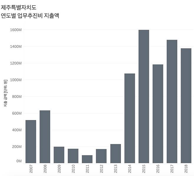 2019년 1월 18일 기준 제주도가 공개한 업무추진비 내역은 2007년부터 2018년까지 총 3만8607건입니다. 액수가 총 87억1095만3554원에 이릅니다. 모든 부서와 기관이 2007년부터 공개한 건 아닙니다. 2014년부터 연도별 합산 금액이 10억원을 넘었죠.
