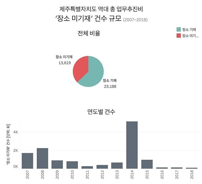다만 이는 출처가 명시된 내역에 한합니다. 사실 업무추진비 전체 내역 3만6807건 중 1만3619건엔 사용 장소가 기재돼있지 않거든요. 3건 중 1건은 어디에서 썼는지 제주도민이 알 수조차 없는 셈입니다. 업무추진비는 2011년부터 모든 지방자치단체가 정확히 의무 공개해야 하는 사항인데 말이죠.
