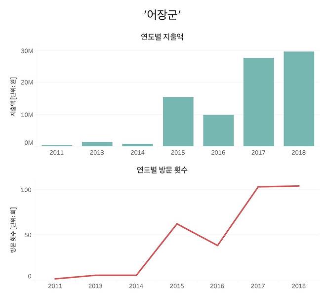 제주도 공무원들의 어장군 사랑은 해를 거듭할수록 커지고 있습니다. 2016년 985만4000원에서 2017년 2754만2000원, 2018년 2954만원으로 매해 지출액이 늘고 있거든요.