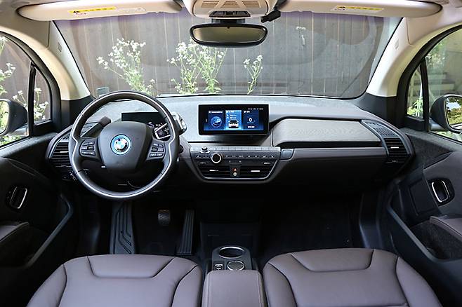 인테리어의 변화는 크지 않다. 통상적인 내연기관차와는 다른 레이아웃이다. 아이 패드를 연상시키는 두 개의 TFT 모니터가 기계가 아니라 전자장비라는 것을 표현하고 있다. 센터페시아 위의 디스플레이는 iDrive를 위한 것이다. BMW 커넥티드 드라이브는 여전히 세일즈 포인트다. 아직은 이 기능을 우리사회의 인프라가 따라가지 못하고 있다. 2017년에 내장재의 변화를 통해 질감을 높였다. 리어 시트 가운데 컵 홀더가 있는 것을 이번에 발견했다.