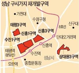 재개발 구역은 총 다섯 곳이다. 수진1(24만2481㎡) 신흥1(19만3975㎡) 태평3(12만698㎡) 상대원3(42만7629㎡) 신흥3(15만3263㎡)구역 등이다. 용적률은 기준 250%에 265%까지 허용한다. 건폐율은 50% 이하다. 성남시는 수진1과 신흥1은 2020년, 나머지 세 곳은 2022년에 정비계획을 수립할 계획이다.