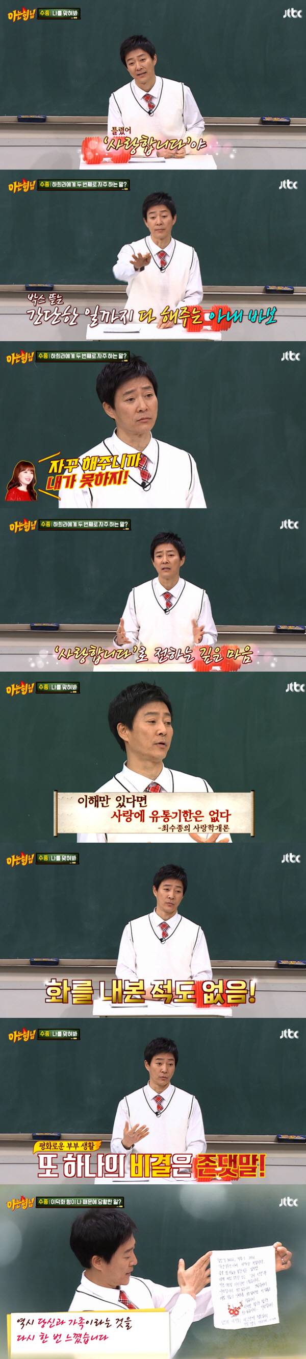[스포츠조선닷컴 정안지 기자] '아는형님' 기승전 하희라였다. 최수종은 '사랑학개론'을 펼치며 남다른 아내 사랑을 전했다.