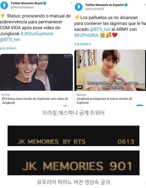 이 외에 트위터 브라질 공계에서 "생존 메뉴얼이 필요하다"며 가슴 울리는 유포리아 영상을 비유했고 트위터 에스파냐 공계에서도 "손수건은 그가 주는 눈물을 닦기엔 충분하지 않다"라는 센스있는 글귀와 함께 그의 영상을 게시하며 곡에서 주는 감동을 표현했다.