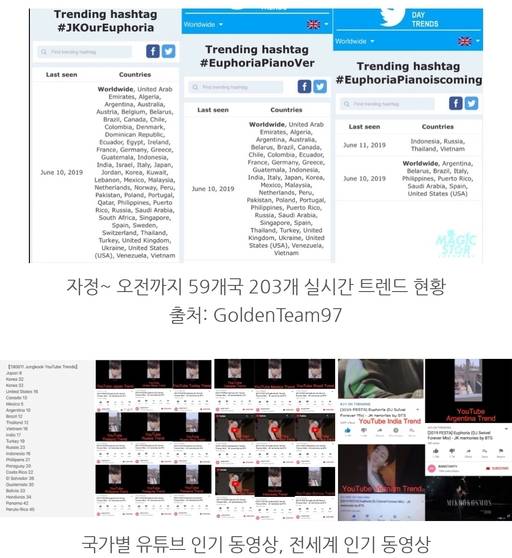 또 몇시간 뒤인 오전(현지시각) 51개 국가 실시간 트렌드에 장시간 올랐고 이날 자정부터 오전까지 '#Jungkook, #Euphoria' 로 총 59개국 중 45개국 1위, 203개 실시간 트렌드, 9개 전세계 실시간 트렌드에도 오르는 폭발적인 기록을 세우며 그의 영향력과 파급력을 입증했고 다음 실시간 연예 5위에도 올랐다.