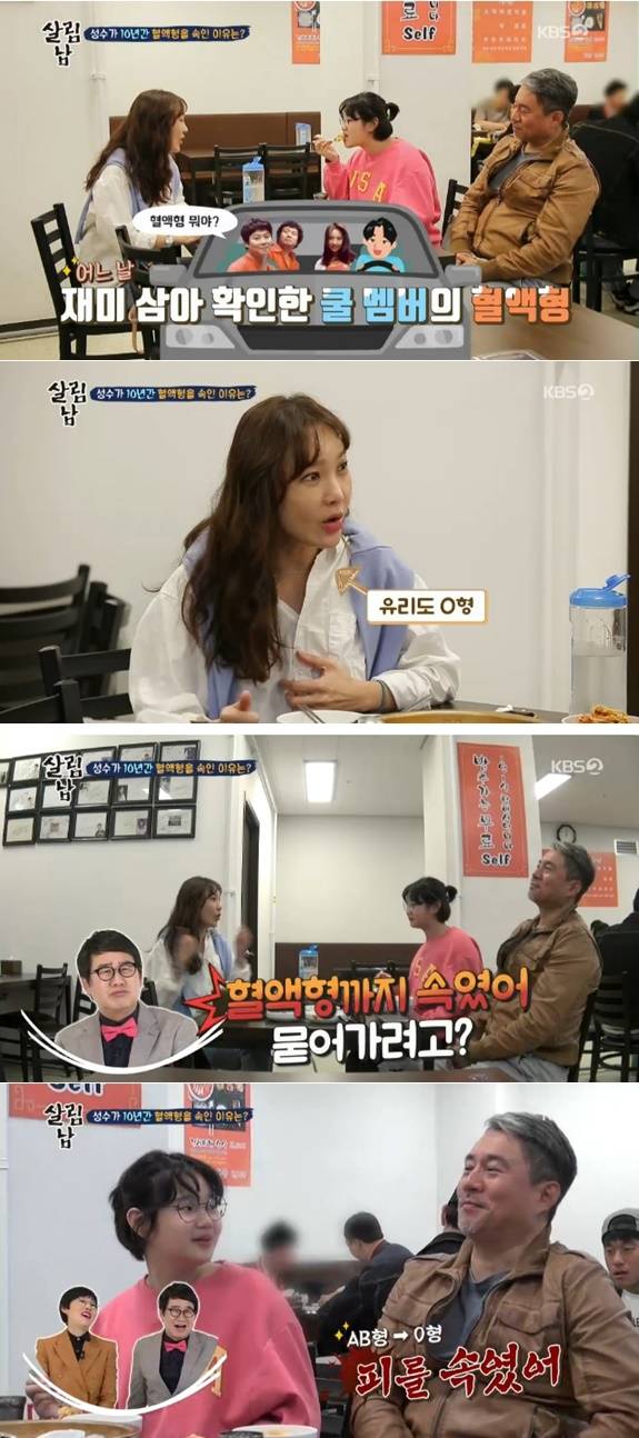 유리는 “옛날에 재미삼아 혈액형을 확인했는데 이재훈은 O형, 나도 O형이었다. 성수오빠한테 물어봤더니 혈액형이 O형이라고 하더라. 그렇게 십년을 넘게 속였다”라며 “나중에 프로필을 보니까 AB형이더라”고 에피소드를 털어놨다. 이에 김성수는 “우리가 이렇게 잘 맞는다는 것을 보여주려고 그랬다”고 해명해 웃음을 안겼다.(사진= KBS 2TV '살림하는 남자들 시즌2’ 캡처)