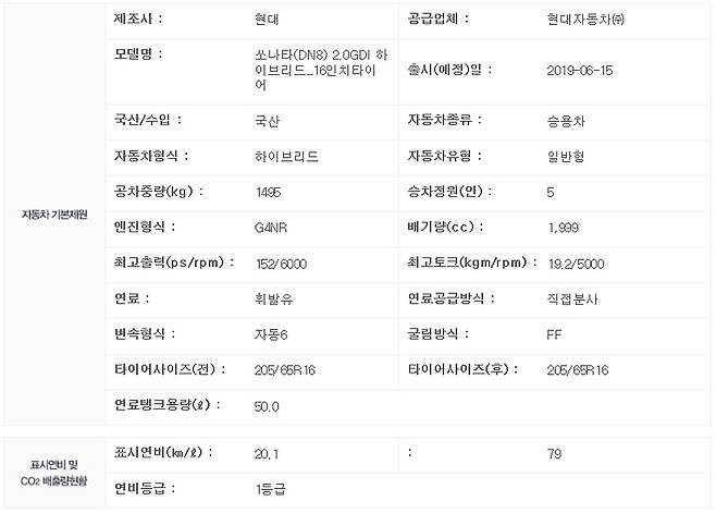 현대차 신형 쏘나타(DN8) 하이브리드의 연비 정보가 공개됐다. 한국에너지공단에 따르면 신형 쏘나타 하이브리드의 국내 복합연비는 20.1km/ℓ(도심 20.2, 고속 20.1)로 기존 쏘나타 뉴라이즈 하이브리드의 18.0km/ℓ 대비 10% 이상 개선되며 효율성이 향상됐다.