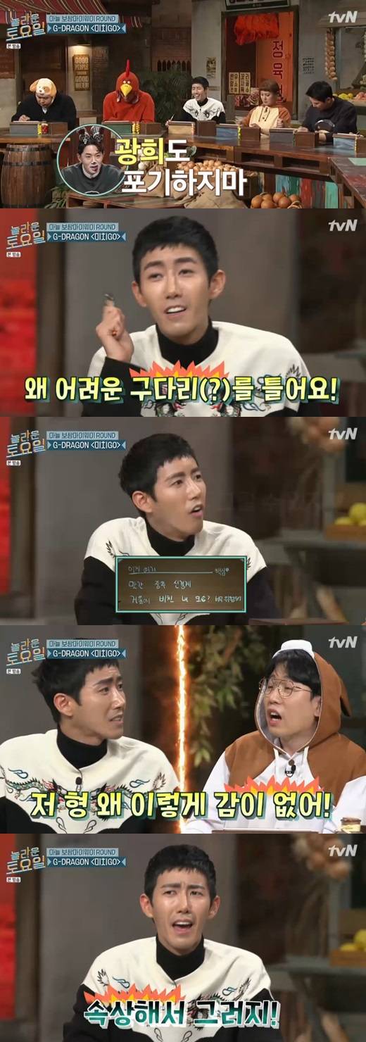 이어 '미치GO' 문제가 출제됐고, 김동현은 "마가 중계 신경계"라고 썼다. 지드래곤과 동갑내기 광희는 "막귀 중추 신경계 그건 너무 위험해"라고 적었다. 해당 답은 "제2의 인격체 맛 간 중추신경계"다.