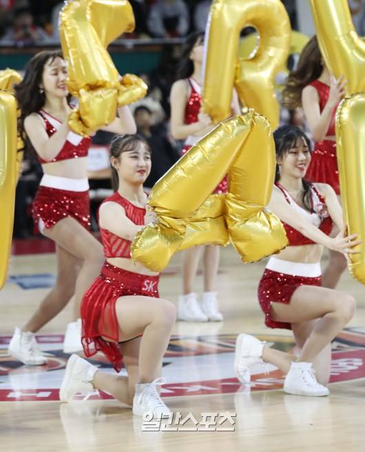 2018~2019 SKT 5GX 남자프로농구 서울 SK-인천 전자랜드 전이 3일 잠실학생체육관에서 열렸다. 치어리더가 화려한 율동으로 팬들의 시선을 사로잡고 있다.