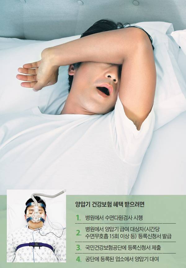 다만 조건이 맞아야 한다. 코골이·주간졸음 증상이 있으면서 해부학적으로 기도 폐쇄가 있거나, 고혈압·당뇨병·고도비만·심장병·뇌졸중 환자에 한해 수면무호흡증 정도를 정확하게 살필 수 있는 수면다원검사를 받을 수 있고, 이 검사를 통해서 증등도 이상의 수면무호흡증(시간당 무호흡·저호흡 15회 이상)이거나 경증 수면무호흡증(시간당 무호흡·저호흡 5~14회)이면서 불면증, 주간졸음, 인지기능 감소가 있으면 양압기를 처방해준다. 양압기는 처음 3개월 대여를 해주고, 사용 실적이 기준치(하루 4시간 이상 사용한 날이 70% 이상) 이상이어야 대여를 계속 받을 수 있다.
