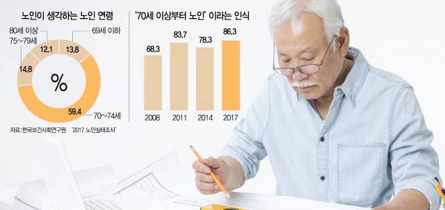 사회적인 공감대도 어느 정도 마련돼 있다. 지난해 복지부가 발표한 노인실태조사를 보면 전국 65세 이상 국민 1만299명 가운데 ‘노인의 나이는 70세부터’라는 답변이 86.3%로 2008년(68.3%)에 비해 크게 늘었다. 한국은행도 기대여명을 반영한 현실적인 고령 기준 나이를 2018년 기준 남성 70세, 여성 74세로 산정했다. 70세 전까지는 ‘부양 대상’이 아닌 ‘일할 수 있는 경제주체’로 봐야 한다는 얘기다.