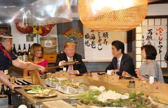 전날 아베 신조(安倍晋三) 일본 총리 부부는 방일 중인 도널드 트럼프 미국 대통령과 멜라니아 트럼프 여사를 초청해 스모 경기를 관람하고 만찬을 함께 했다. 양국 정상 부부는 도쿄의 번화가 롯폰기(六本木)에 있는 일본식 선술집 '로바다야키'에서 만찬을 함께 했다. 로바다야끼란 제철 조개류 및 고기, 야채를 손님이 보는 앞에서 화로에 구워주는 일종의 '그릴 구이'를 말한다.