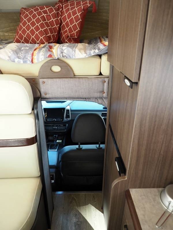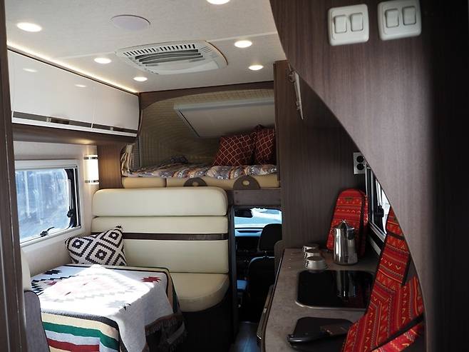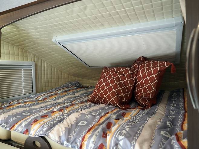 비록 2인승이지만 캠핑공간은 4인승으로 꾸몄다. 네 명이 앉을 수 있는 테이블을 마련했고, 침대도 앞뒤 두 명씩 총 네 명이 누울 수 있을 만큼 너비가 넓다. 그러나 캠핑용품이 대개 그렇듯 성인 남성 넷이 쓰기엔 너무 북적거릴 듯하고, 어른 둘과 아이 둘 정도는 넉넉히 쓸 수 있겠다. 운전석 위 침실은 천장이 낮지만, 하늘로 뚫린 큼직한 유리창과 양옆 유리창까지 총 3방향으로 뚫려있어 답답지 않다.